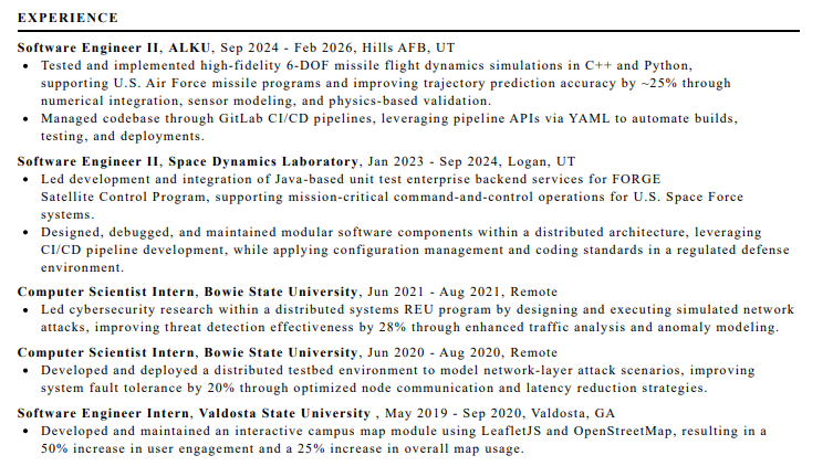 My experience spans high-consequence defense and aerospace programs where precision, reliability, and compliance are non-negotiable. As a Software Engineer II supporting U.S. Air Force missile programs, I developed and validated high-fidelity 6-DOF flight dynamics simulations in C++ and Python, improving trajectory prediction accuracy by approximately 25% through rigorous numerical integration, sensor modeling, and physics-based validation. At Space Dynamics Laboratory, I led development and integration of Java-based backend services for the FORGE Satellite Control Program, supporting mission-critical command-and-control systems for U.S. Space Force operations within a regulated, distributed architecture. Earlier in my career, I strengthened my systems foundation through cybersecurity research and distributed systems internships, improving threat detection effectiveness and fault tolerance through performance modeling and attack simulation. Across roles, I have consistently operated in structured, compliance-driven environments while delivering measurable performance improvements and maintaining disciplined CI/CD practices.